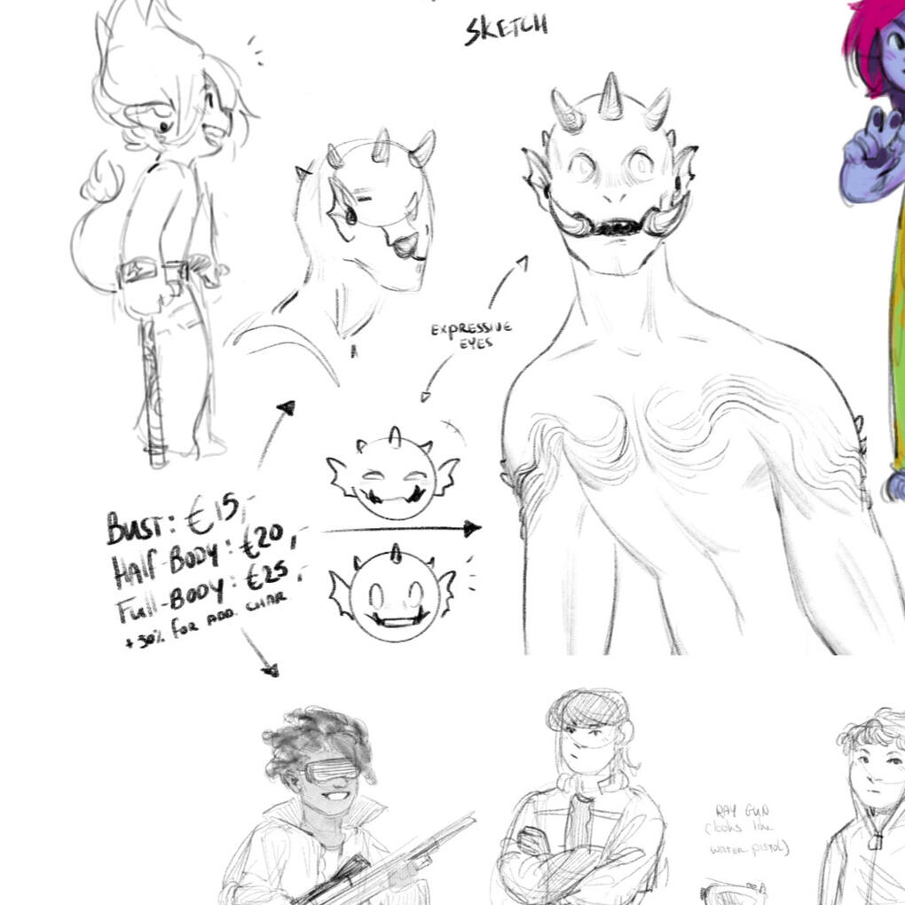 - €25,- for a full-bodyAdditional characters are +50% of the price.Sketches can be colored for an additional €5,- fee for flat colors, or a €10-15,- fee for rendered colors (shading + highlights).Any additional elements (backgrounds, character ref sheets, multiple versions, etc.) may cost extra.