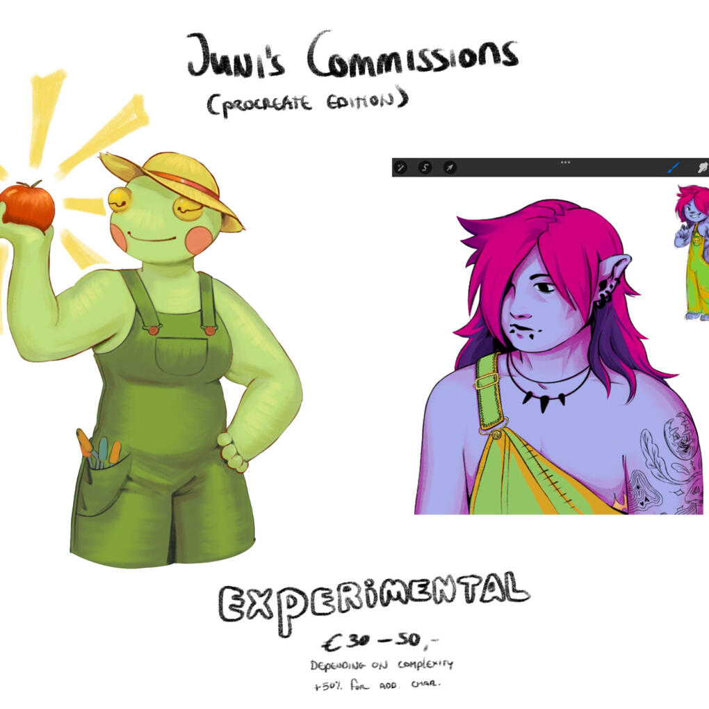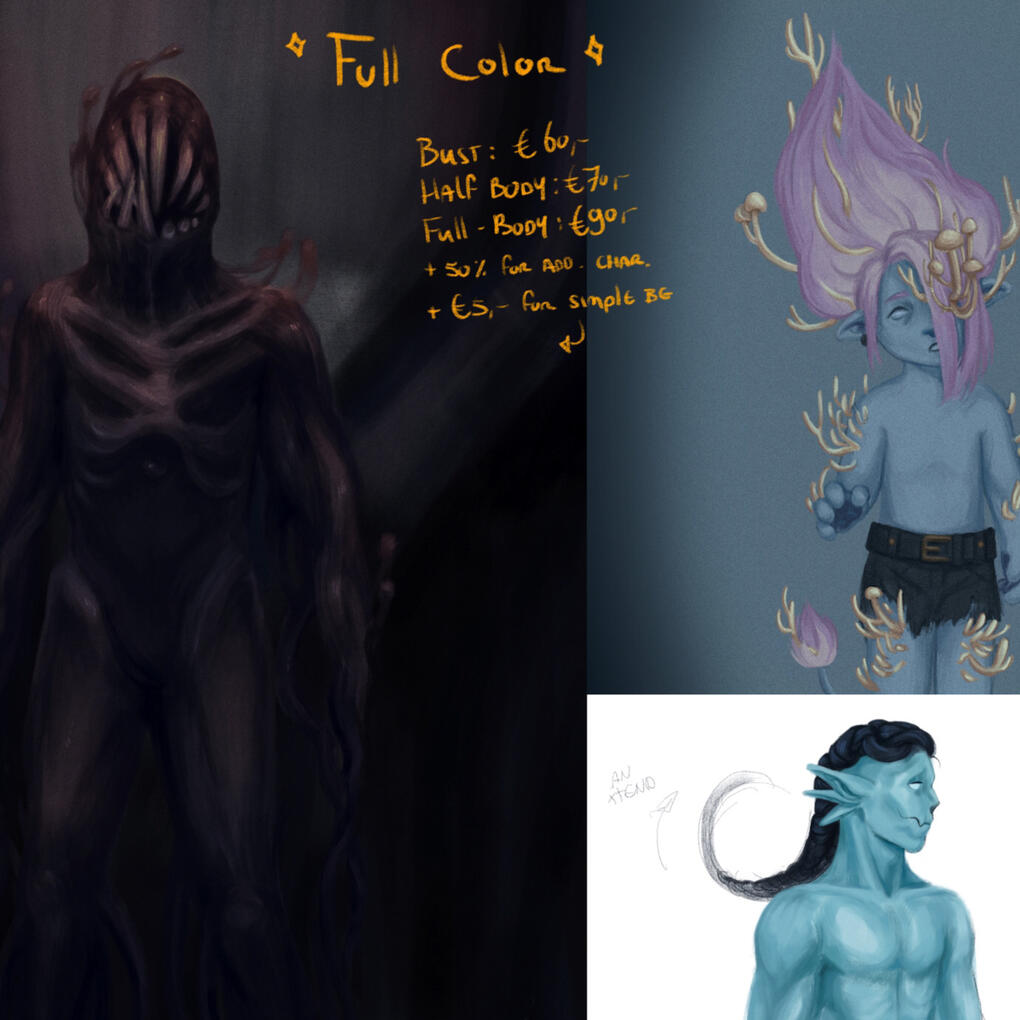 depending on complexity.Experimental commissions are fully colored, unless discussed otherwise. For this commission type, I employ brushes and techniques that I'm still learning to use or am otherwise unfamiliar with, allowing me more creative freedom and resulting in an unique but potentially less polished piece.Additional characters are +50% of the price.Any additional elements (backgrounds, character ref sheets, multiple versions, etc.) may cost extra.